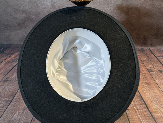 Black Diamond!  Simple but unique. This black on black short brim hat stands out because of the custom shaped crown: diamond shaped. The width of the brim is just at 2 inches. We're classy over here. We've added a simple leather like band around the crown and black grosgrain ribbon edge dressing around the brim. For added fun and creativity we added a white silk hat liner. Hint: your's may be different. This brim is perfect for everyday use. This hat is available in most hat sizes.