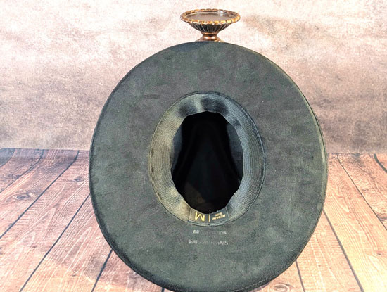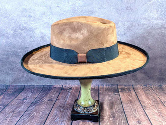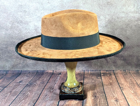 Fudge Brownie! Oh so taste and see. You will look very appetizing in this brown and black vegan suede wide brim fedora. You can wear this two toned fedora with just about any outfit. We've wrapped the crown with a black grosgrain ribbon with a brown center accent. The black pencil brimmed edge adds a character to this brim. Fudge Brownie is sturdy and has a snug fit due to the elastic sweat band. Additionally, it is available in two different sizes to fit your specific needs: medium and large. Like all of our custom hats, there are a limited number available.