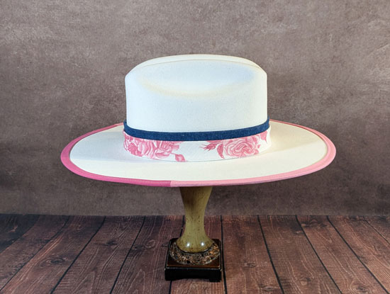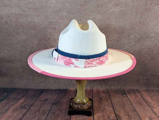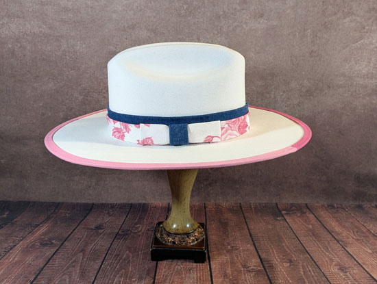 Pink Clouds! A crispy white hat with a denim hat band accompanied with a white and pink floral wrap and a two tones pink brim edge dressing. Perfect for any time of the year. White party! All eyes will be on you. This hat is available in most hat sizes. Like all of our custom designed hats, there are a limited number available.